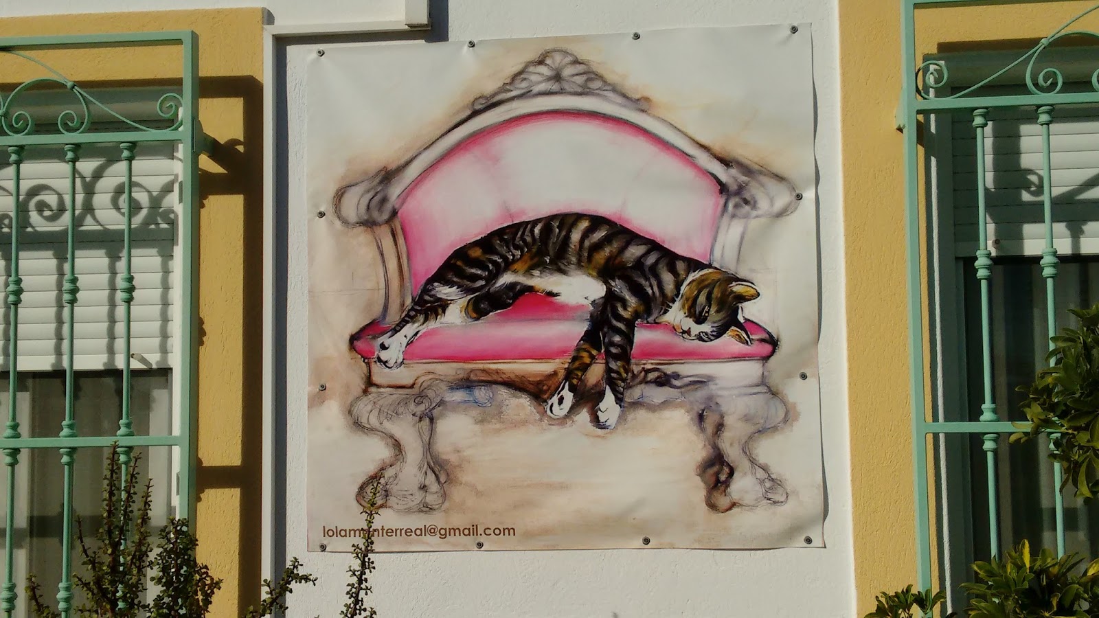 The village of Rodalquilar, where we stayed last year, has a number of resident artists and writers, and has transformed itself into a living art gallery, Rodalquilarte. This year a number of new works of art have been displayed on the walls of the houses and shops. This gorgeous cat is by Lola Monterreal.